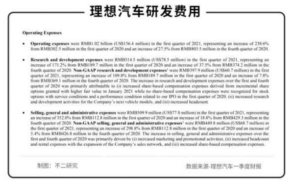 在「不二研究」看来,理想的主要营收来源是整车销售,其汽车销售收入在2021第一季度总营收中占比为96.88%。