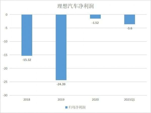 从这个角度看,二级市场保守看待理想就不难理解。依照理想向港交所提交的招股书,它迄今为止仍然只有理想One一款车型,业绩更是始终不曾脱离亏损阴霾。2020年,理想汽车终于在毛利指标上实现扭亏为盈,归母净利润的表现却一直不甚理想,2020年有所收窄的净亏损昙花一现,最新数据显示2021Q1的亏损扩大到了3.6亿元,超过2020全年。