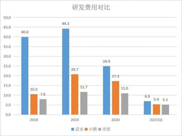 造车的烧钱流露在生产线上的方方面面,可无论任何,技术创新才是提高竞争力、树立品牌护城河的核心动力。关于2020及2021Q1的亏损,理想归因给了研发与营销费用。而在研发费用方面,理想受益于增程式优先战略,支出常年低于蔚来及小鹏,在今年一季度确定重视高压纯电路线后才开始增加投入。