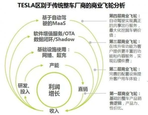 艾瑞咨询《中国智能互联-汽车产业变革研究报告》中的阐述证实了以上观点。报告表示,特斯拉是传统汽车市场的颠覆者,除了一次性的车辆销售收入外,智能网联技术会为公司带来长期、持续的现金收入,这为特斯拉打造了区别于传统整车厂商的四层商业飞轮。