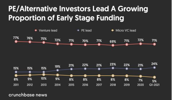 下图中红线和黄线代表VC和小型VC在早期项目中的领投情况,分别下降6%和3%;蓝线是PE等非传统投资机构的走势,增长了9%。