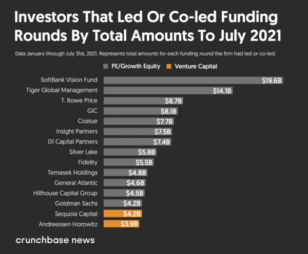 下图显示的是今年截至7月底,全球的机构领投和联合领投创业公司的情况。在15家投资金额最多的机构中,传统VC只有排在末尾的a16z等一二家,其余都是非传统基金,比如愿景基金、老虎基金,银湖资本和高盛。