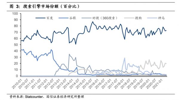 由于搜索引擎的技术壁垒,除了谷歌,百度难逢敌手,吃尽了国内PC普及率和上网率上升的红利。谷歌退出中国市场之后,百度的地位更是无法撼动。