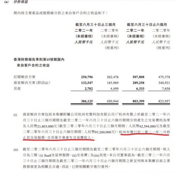 造成商家解决方案收入下滑的原因之一是交易费用减少。财报指出,有赞已于2021年2月终止其交易服务(即将支付业务剥离上市主体),且其后不会产生交易费收入。