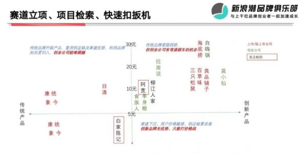 扫描整个赛道之后,我们就从右上角的象限里去找。在这个象限内,虽然传统品牌紧跟趋势,但是创业公司也有通过新渠道、新品牌超车的机会。