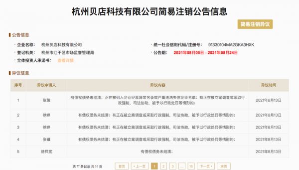 截至发稿,已有超40人在国家企业信用信息公示系统,对贝店科技的注销申请提交异议信息,理由为“有债权债务未结清”。