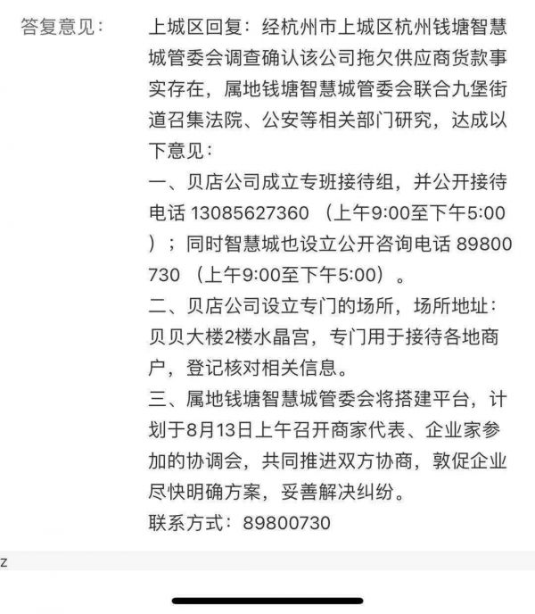 此前,杭州市上城区杭州钱塘智慧城管委会曾回复商家表示,经过调查确认,贝贝集团拖欠供应商货款事实存在,并达成意见:贝店成立接待各地商户的专班接待组和场所,并且在8月13日与商家代表开会协商。