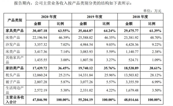 根据招股书显示,2018-2020年,趣睡科技实现营业收入4.8亿元、5.52亿元、4.79亿元,对应净利润分别为4387万元、7392.98万元、6787.95万元。其中,占据半壁江山的床垫产品,三年来的收入分别为2.34亿元、2.56亿元与2.22亿元,占比分别为48.70%、46.35%与46.39%,接近五成。