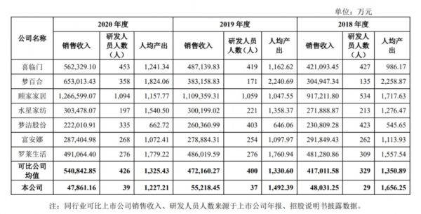 此外,2020年趣睡科技共有142名员工,其中研发人员为39人,占比27.46%。而喜临门、梦百合、顾家家居、水星家纺等公司分别为427人、135人、534人和213人,数量差别大。