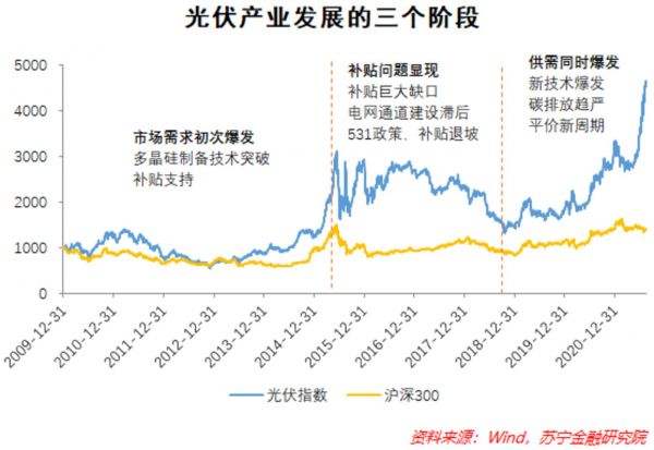 第三阶段,2019年至今,由于成本的持续下降,光伏发电价格逐步接近火力、水力发电。政策也明确了竞价和平价共存的模式,2020年国内竞价、平价结果超预期,叠加全球碳减排目标提升,坚定光伏发展信心。龙头大举扩产,新技术爆发,都在带动光伏板块大幅上涨,尤其是龙头表现更亮眼。