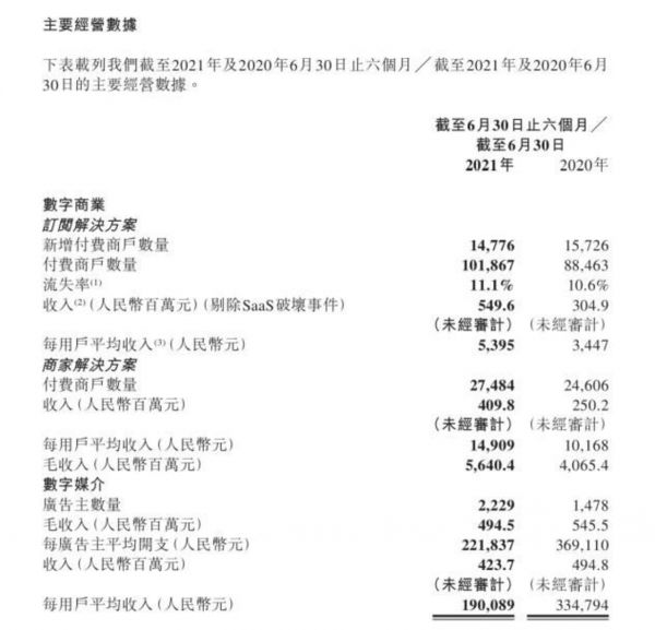 另外,财报披露上半年微盟集团商家解决方案服务商家获取流量的精准投放毛收入56.4亿元,较2020年上半年增长38.6%;纯收入4.1亿元,同比上升63.8%;付费商户数27484名,每用户平均收益14909元,同比增长46.6%。