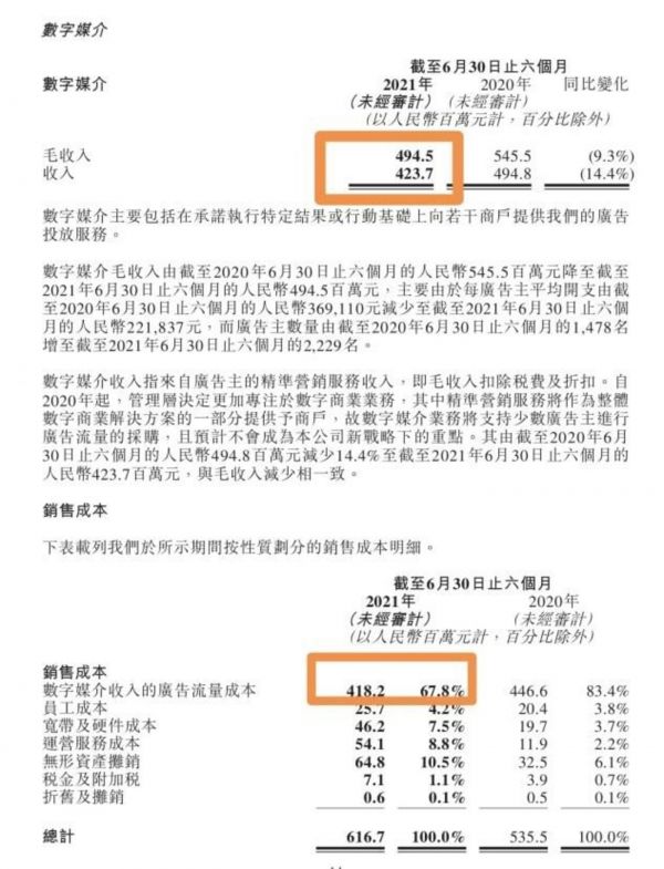 另外一部分针对于形象或者品牌广告,微盟也有单独的收入列支。财报数据显示,微盟在数字媒介领域的纯收入是4.23亿左右,但所要支付的成本是4.18亿。这实际上意味着这个产品在非盟整个收入体系之中,根本就没有对内蒙收入的多元化起到很好的作用。