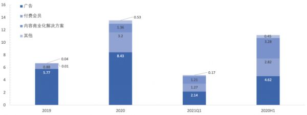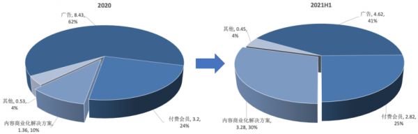 2019年,广告业务的收入占比高达86.1%;到2020年末时,该比率骤降到了62.4%;到2021Q1,该比率已不足50%(44.8%);再到2021H,该比率还在继续下降,最终录得41%。