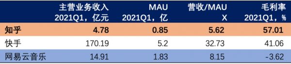 表2:知乎、快手、网易云音乐的运营和财务数据