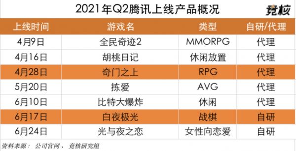 据不完全统计Q2期间,腾讯共上线7款新游,其中5款为代理,2款为自研。