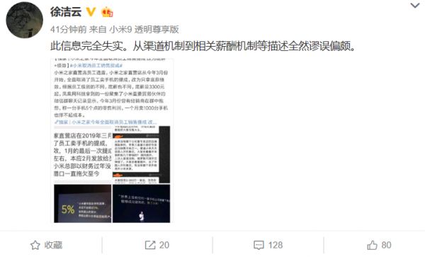 对于今天有关“小米之家直营店全面取消了员工销售提成,改为只拿底薪+绩效”的报道,对此,小米集团公关部总经理徐洁云在微博回应称,“此信息完全失实。从渠道机制到相关薪酬机制等描述全然谬误偏颇”。