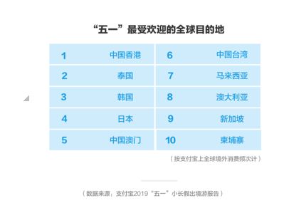 支付宝今天(5月5日)公布的2019“五一”小长假出境游报告显示:今年“五一”出境游依然火爆,人均使用支付宝消费金额近1800元,比去年增长逾一成。 “五一”全球哪些地方最受国人出境游欢迎?从消费频次上看,中国香港、泰国、韩国、日本、中国澳门、中国台湾、马来西亚、澳大利亚、新加坡和柬埔寨位列前十。