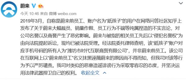 上午消息,蔚来发布微博再度回应“大幅裁员、销量作假”一事。蔚来称发布该消息的知乎网友“紙孩子”并非蔚来前员工,其捏造的不实言论对公司名誉以及商誉产生了恶劣影响,已起诉该网友。蔚来3月就曾针对此事发表回应,称所谓“销量作假”及“大幅裁员”纯属捏造。