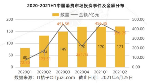 但单从数据上看,“收紧”的趋势还不明显。据IT桔子数据,在今年第一季度,中国消费市场投资事件数量达到了170起,第二季度为171起,几乎保持一致。不过在投资总金额上,第二季度比第一季度减少了约100亿元。