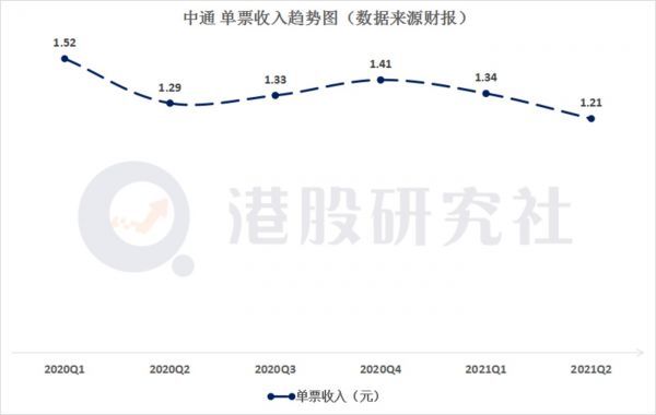 报告期内,中通的单票价格下降5.9%,至1.21元,这也是自2020年Q4季度开始,实现三连降。反观通达系单票收入均在2元以上,数据显示,申通、圆通、韵达的单票收入分别为2.12元、2.10元、2.02元,远低于同行的单票价格,或许也是中通本季度增收不增利的关键。
