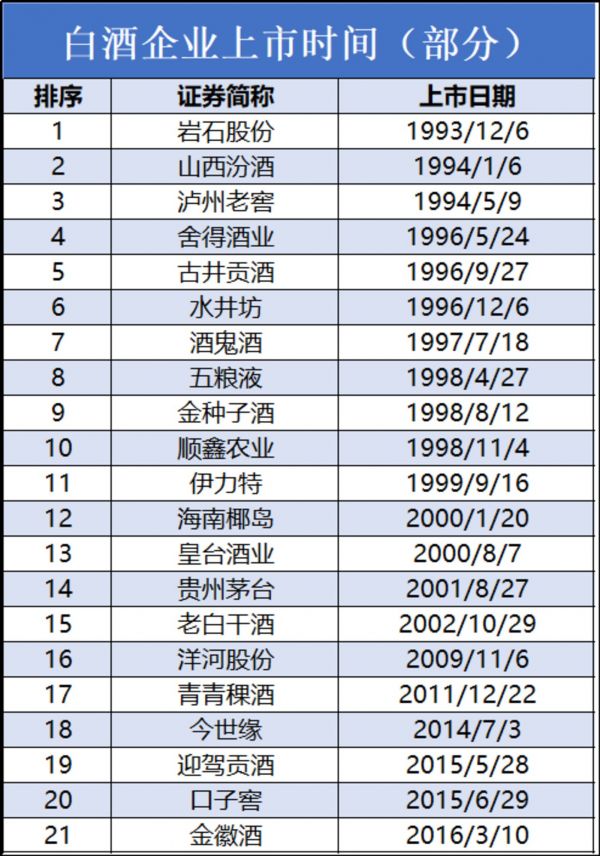 自1993年以来,总共有20余只白酒股先后登陆A股,老八大名酒中除了剑南春、西凤酒、董酒之外,其余悉数上市。此外,包括郎酒、国台酒等在内的品牌也均在近年宣布上市计划,开启资本征程。