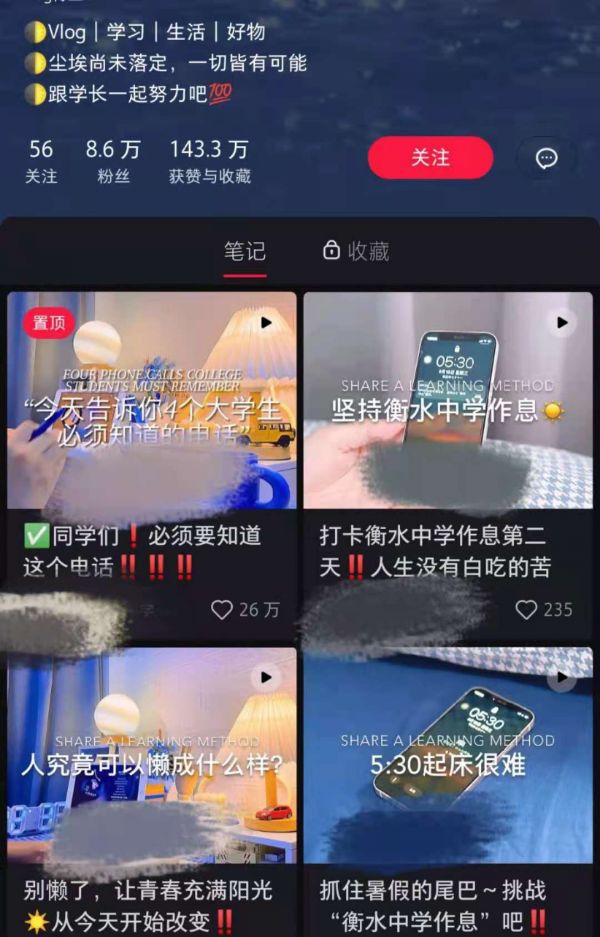 家住广州天河五山的张烨,目前已经辞去工作,正在全力考研。她告诉懂懂笔记,自己所关注的这位小红书上的学习博主,自称也在全力考研冲刺中,每天都会定期分享学习心得、技巧等图文或视频内容。