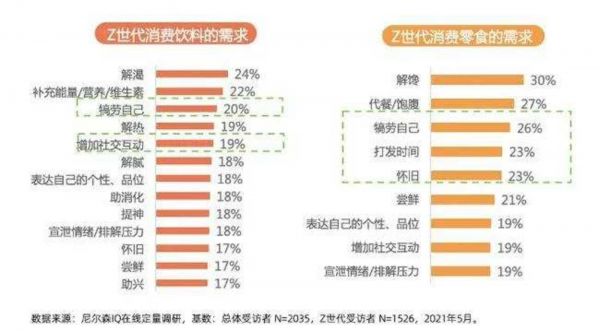 尼尔森IQ调研数据显示,除了满足解渴饱腹等基本的功能类需求外,受访者中,Z世代对饮料零食还有着额外的情感类需求,如犒劳自己、打发时间、怀旧等。