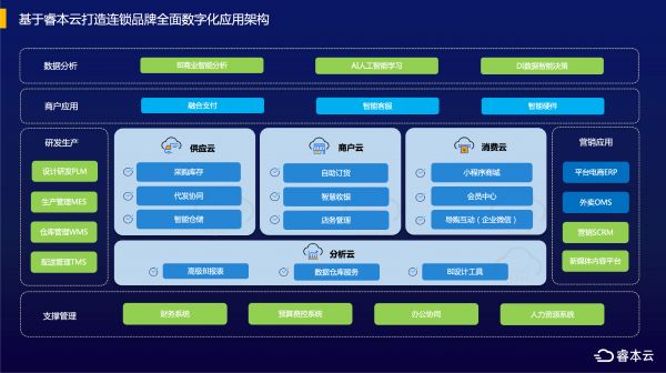睿本云通过消费云、商户云、供应云实现品牌直连消费者、终端商户、供应商。同时睿本云还沉淀出基于消费大数据的分析云以及可高度扩展的aPaaS技术平台等,帮助大中型连锁品牌建立在新商业领域深度应用数字化的能力。