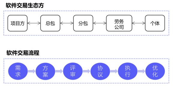 专业服务领域存在着明显的痛点,软件外包行业是其中的典型,流程复杂、过程数据匮乏成为该行业标准化的最大障碍。这是因为软件外包生态复杂,包括项目方、总包、分包、劳务公司、个体等众多参与者。此外,软件交易流程中的需求、方案、评审、协议、执行、优化等环节要在参与者之间不断调整。不同于实物交易的标准化体验,软件交易的生产、协作、交付的长工作流程存在过程不透明问题,导致黑盒式交易。