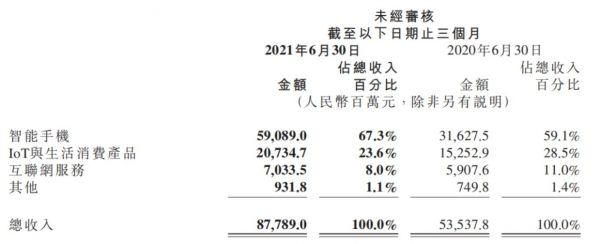 最后是互联网服务。该部分收入由2020年第二季度的59亿元增加19.1%至2021年第二季度的70亿元。MIUI的全球月活跃用户由2020年6月的343.5百万人增加32.1%至2021年6月的453.8百万人。