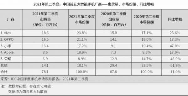 根据国际数据公司(IDC)手机季度跟踪报告显示,2021年第二季度中国智能手机市场按出货量排名前五依次为:vivo、OPPO、小米、Apple和荣耀。其中小米得益于K40以及小米11 系列的贡献,同比增幅达到了47%;而vivo和OPPO依旧闷声发大财,并牢牢稳坐前两名。