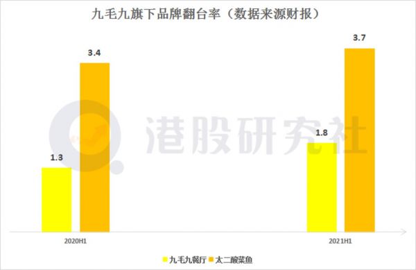 相对海底捞,九毛九旗下品牌都具备实体店,由于门店数量相对较少,对门店分流的影响较小,期内,太二翻台率上涨至3.7,怂重庆火锅厅达到2.2,从主品牌的翻台率上,九毛九的翻台率达到1.8。