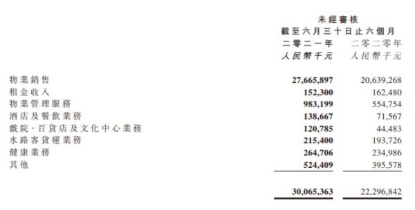 收益组成来看,2021年上半年佳兆业物业销售的收入为276.66亿元,远超其他板块的收益,物业管理服务录得9.83亿元,租金收入为1.52亿元,酒店及餐饮业务收益为1.39亿元,戏院、百货店及文化中心业务的收益为1.21亿元,水陆客货运业务收益为2.15亿元,健康业务为2.65亿元,其他方面的收益为5.24亿元。