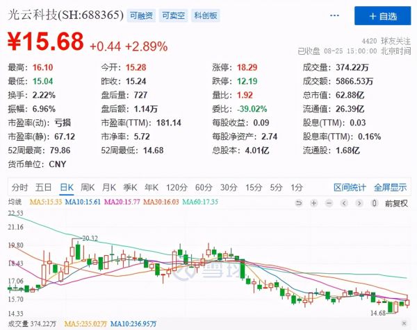 资本市场表现上,截止8月24日A股收盘,光云科技股价下跌了1.87%,报15.24元/股。可见,市场对光云科技这份半年报不甚满意;但在8月25日,股价却拉涨了2.89%,总市值达到62.88亿元。