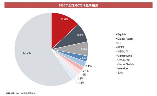 2020年,Equinix以一己之力占据全球IDC市场13%的份额,在极度分散的市场中具有无与伦比的规模效应。这得益于它的全球化布局与区位优势,比如在国内,Equinix早早建设了上海等重要城市的数据中心,抢占了核心位置。