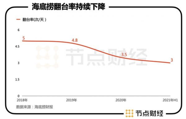 2021年上半年,海底捞的翻台率为3次/天,比2020年疫情期间又减少了0.5次/天。