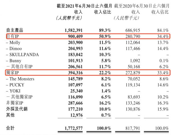 包括自有IP、独家IP、非独家IP在内的自主产品,已经成为泡泡玛特的核心收入来源,这部分的收入从2020年上半年的6.87亿元,增加到2021年上半年的15.82亿元,同比增长130.4%。收入占比也进一步加大到89.3%,超越去年同期的84.1%和2019年全年的82.1%。