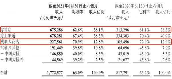 在线上流量越来越贵的环境下,泡泡玛特首先想尽可能地抢占线下点位。财报显示,泡泡玛特在2021年上半年线下渠道(包含零售店、机器人商店)收入占比依旧最高,达50.9%,但较去年同期的51.2%略有下降。