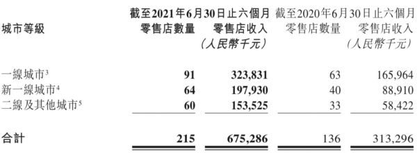 零售店收入从2020年上半年的3.13亿元增加到2021年上半年的6.75亿元,同比增长115.5%,但不同城市之间创造的收益差距明显。新一线、二线及以下城市加起来的收入达2.04亿,一线城市的收入便达1.58亿。