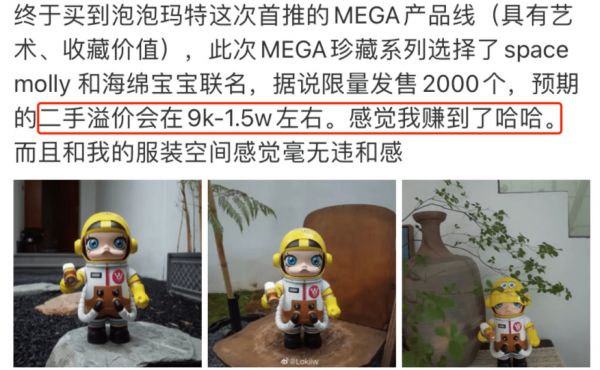今年,泡泡玛特推出了高端潮玩产品线“MEGA珍藏系列”,价格达千元级别,其中部分型号限量发售3000个,抽号购买,称要打造年轻人第一件收藏品。但有用户认为看起来还是个放大版盲盒,也有用户已经开始期待二手溢价。