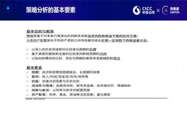 策略的分析是什么呢?策略的分析是在宏观分析的一个基础上,再纳入到我刚才讲到的宏观的变量,往前再推演一步,推演到我们得出一些结论,得出配置的结论。