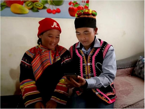 图:云南省临沧市沧源县拉祜族群众使用语言扶贫APP场景