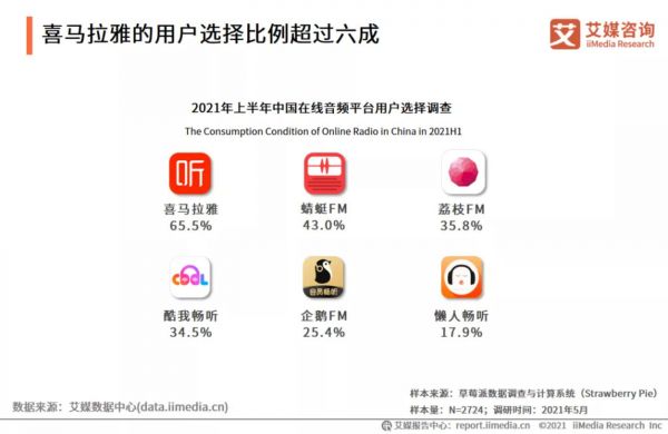 《艾媒咨询|2021H1中国在线音频产业运行监测调研报告》(下文简称《报告》)显示,2021上半年,喜马拉雅以65.5%的高市场占有率成为最多用户选择的在线音频平台,而荔枝仅处于第三位,被喜马拉雅、蜻蜓分别拉开了29.7%、7.2%的距离。
