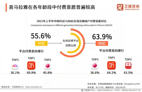 与之呼应,2021上半年,喜马拉雅的月均活跃用户量、在各年龄段中的付费意愿以及平台付费用户满意度比例同样远高于荔枝。