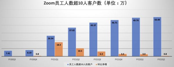 Zoom更加依赖订阅用户,因此现有用户的转化会对Zoom营收产生直接影响。不过需要提醒的是,员工人数超10万的客户单季净增在减少,本季环比净增8000,低于上一季度30000的净增,上年同期单季净增更是超10.5万。