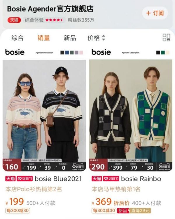 目前,Bosie天猫官方旗舰店目前拥有355万粉丝,对一个年轻品牌来说成绩斐然,其产品列表显示,大多数服装款式均不分特定性别,具有很强的普适性。Bosie的迅速成长表明,它确实抓住了市场和消费者的一些核心需求。