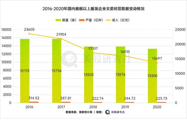 2020年,我国社会消费品零售总额352453亿元,服装鞋帽和针纺织品以12365亿元排在总大类第四名。然而,从2016年开始,我国规模以上服装企业的数量、产量、收入、利润都在波动中下滑。
