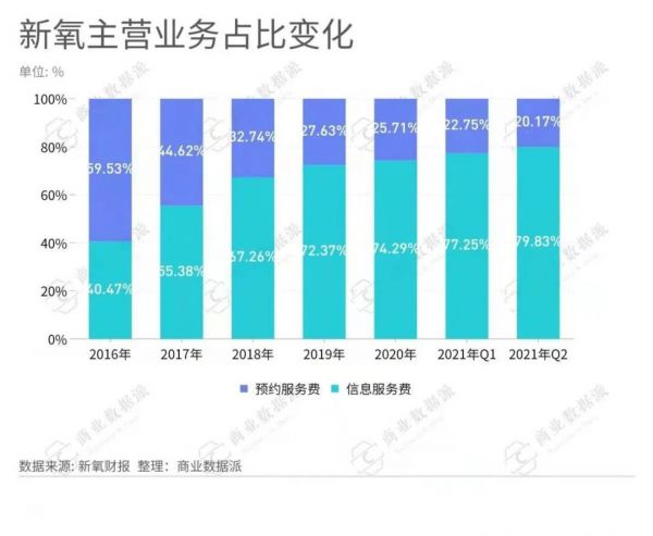 2016年之前,新氧的主要收入来源为预约服务费,2016年预约服务费占新氧营收的59.53%,信息服务费仅占40.47%,此后信息服务费版块的营收占比持续升高。2021年Q2信息服务费占比已达79.83%,这一趋势直观显示出新氧营收基本面的变化——信息服务费已成新氧主要营收支柱。