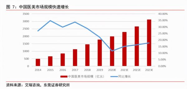 据艾瑞咨询统计,2013-2019年,中国医美的市场规模从378亿元涨至1769亿元,艾瑞咨询预测到2023年,我国医美市场规模将增加到3115亿元,是2019年市场规模的1.76倍,医美市场正在加速扩容。
