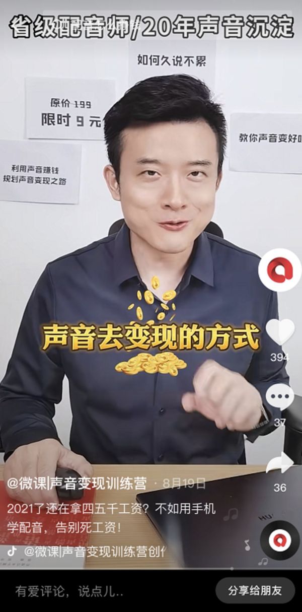 “你要悄悄地学习配音,然后默默地增加收入。”正如这样一则有关配音训练班的短视频广告,“配音行业正大量招人”“花几块钱就能获得一个入行机会”的消息,引起了不少人的注意,其评论区内还留下了大量“想学”“已报名”的声音。